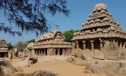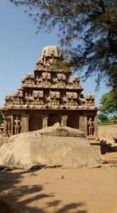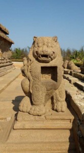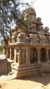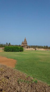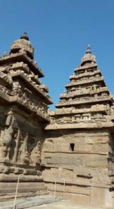 Mahabalipuram – the Shore Temple. Built between 700 and 728 AD by Pallav king Narsimhaverman I it is today a world heritage site. It consists of three shrines, two to Shiva and a central shrine having a reclining Vishnu made out a single rock. The sun rays enter the east and west facing shrines at sunrise and sunset. It is accepted that in ancient times there was a group of 7 such temples at this site which acted as landmarks for ships sailing in from East Asia as well as Europe for trade at ports all along this part of the coast.