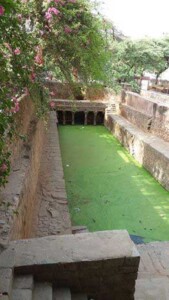 In the above photograph taken on 22nd of May (last month) the Gandhak ki baoli was nearly filled with water, reaching the top floor, but it is a 5 story step well with pillared corridors all around. The water in this step-well contains sulphur and smells of it, giving it its name. It was said to have medicinal properties. The Baoli lies in the heart of Mehrauli market.
